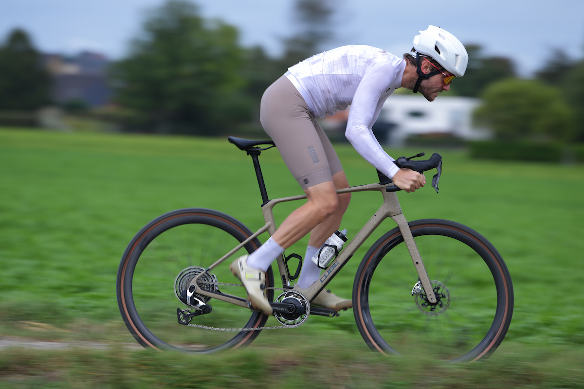 Zodra je opstapt veranderen die heerlijke looks in realiteit. Het frame weegt slechts een fractie van wat je zou verwachten bij een gravelbike en met een totaalgewicht van 7,75 kilo is de Nuroad C:62 SLT een van de lichtere gravelracers die je op de markt kunt vinden. Dat merk je meteen bij het accelereren: geen vertraging, geen verlies, enkel directe energieoverdracht. Cube gebruikt hier zijn eigen C:62 carbontechnologie waarbij de vezels zo zijn gelegd dat je maximale stijfheid krijgt op de plekken waar dat nodig is – de trapas en de liggende achtervork – terwijl de voorvork en de bovenbuis net genoeg beweging toelaten om de scherpe randen van het gravelrijden weg te filteren. Die 62 slaat overigens op het percentage carbon dat in het frame gebruikt wordt. Het resultaat is een frame dat stijf is waar het moet en soepel waar het kan. Over de lichtbruine kleur van de testfiets heerste onder de testers nog onenigheid, aan de 2026-kleurstelling van de Nuroad C:62 SLT hield de jury wel een collectieve kaakverstuiking over toen hun mondjes openvielen van bewondering. Of om het in jongerentaal uit te drukken: vet cool!