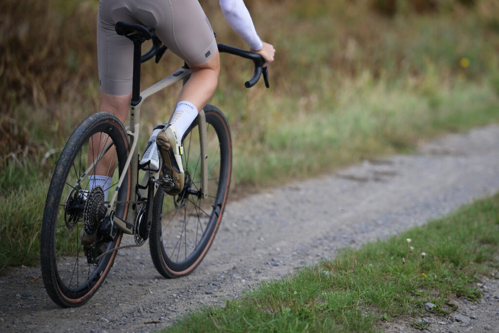 Een belangrijk deel van de ervaring van de Nuroad komt van de wielen. De Newmen Advanced SL X.R.36 wielen zijn als de vleugels van deze fiets, deze wielen maken het verschil tussen gewoon fietsen en vliegen. Hun lage gewicht en hoge zijdelingse stijfheid garanderen razendsnelle acceleraties en haarscherpe stuurlijnen. Op asfalt rollen ze bijna geluidloos, alsof je over een gladde spiegel glijdt. Maar hun ware talent komt naar boven als je het gravel op stuurt. Waar lichtere wielen soms nerveus worden van zodra de ondergrond losser wordt, blijven deze Newmens kalm en stabiel. Alsof ze op onzichtbare rails door het grind geleid worden. In snelle afdalingen geeft dat het vertrouwen om harder te gaan dan je normaal zou willen, durven of kunnen. Handjes los op het stuur, blik ver vooruit en geef maar gas. Het is dat gevoel dat een goede wielset onderscheidt van een middelmatige: niet alleen snelheid, maar ook vertrouwen. Doe daar nog een setje snelle Schwalbe G-One RS Pro-banden rond en je begint te beseffen dat deze Nuroad excelleert in standje ‘vooruit’.