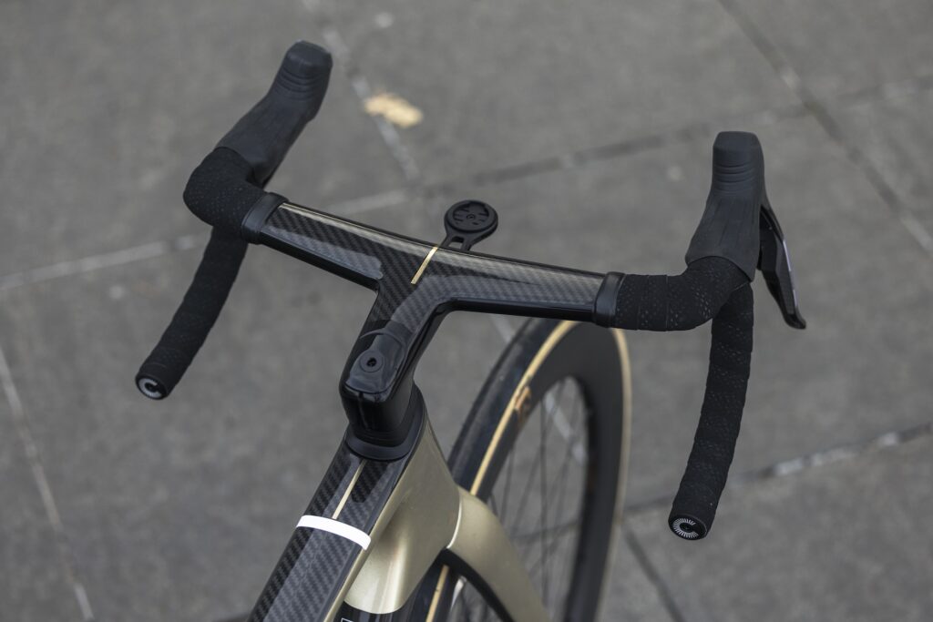 Ook op vlak van geometrie gebeurden er geen wereldschokkende dingen. De wielbasis is een centimeter kleiner, de stackhoogte ging zo’n twee centimeter naar omlaag en de bovenbuis werd langer. Zo krijgt de fiets op vraag van de EF-renners een meer wedstrijdgerichte fit. De maximale bandbreedte werd dan weer opgetrokken van 30 naar 32 millimeter. Een laatste significante ingreep, is de switch naar de nieuwe SystemBar Road cockpit. Die weegt 375 gram, is standaard 36 centimeter breed (al zijn er ook 34 en 38 centimeter brede varianten) en ligt met z’n goed uitgekiende reach, drop en flare prima in de hand. Uiteraard is de bovenkant van het stuur afgeplat omwille van de aerodynamica.