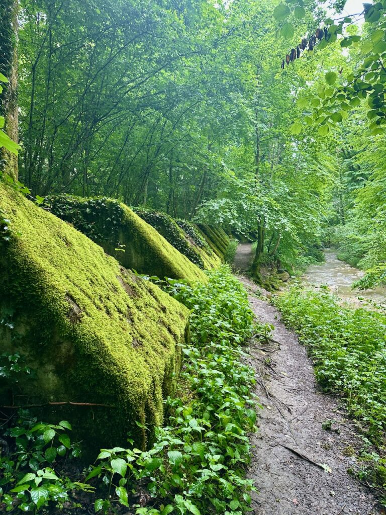 Ze vormen een historische verdedigingslinie tussen Bassins en Gland, nu omgevormd tot wandelpad. Tussen het groen steken de blokken als stille wachters boven het gras uit – een surrealistisch gezicht.