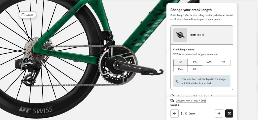 Dankzij deze uitbreiding van het MyCanyon-programma worden zowel de esthetiek als de pasvorm verbeterd. Bovendien zijn er ook nieuwe specificaties voor de cranklengte beschikbaar. Naast cranks van 170, 172,5 en 175 mm biedt Canyon nu ook cranks van 160 mm van Shimano en cranks van 160, 165 mm en 167,5 mm van SRAM. Eind november 2025 worden daar cranksets van 165 mm van Shimano en 162,5 mm van SRAM aan toegevoegd.