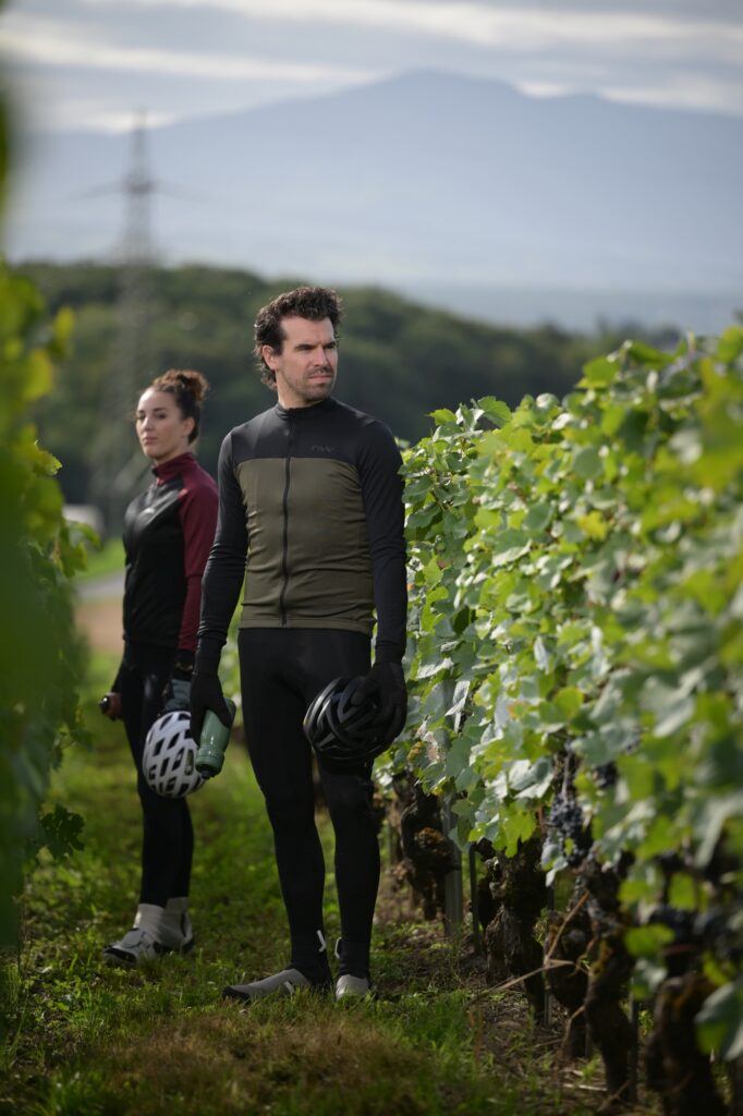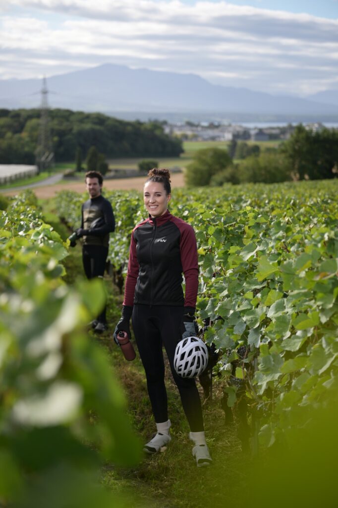 Rondom het Zwitserse Nyon kan je ook genieten van de wijngaarden van La Côte. Dat is precies wat Lorenzo en Fatima deden tijdens het maken van de modekatern Shot, met de winteroutfits voor 2025-2026. Ze bewonderden de druivenranken in spullen van het Italiaanse Northwave.